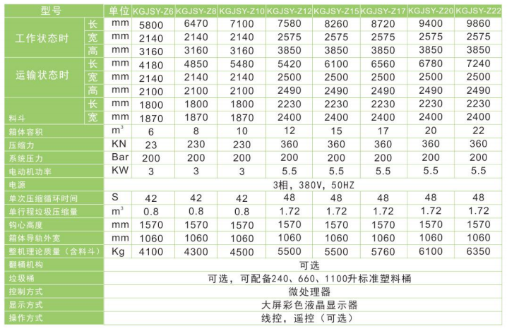 智能移動式壓縮垃圾站為壓縮機與箱體合二為一的連體機,在垃圾收集、壓縮、轉運過程中不分離,被譽為“移動垃圾處理專家”,整體設備智能化、故障率低,垃圾全部密封在垃圾箱內,不會對環境造成二次污染,簡單易處理。 智能移動式垃圾壓縮設備,目前國內外小型城市生活垃圾站,垃圾處理方式基本上均采用壓縮方式,按壓縮力方向又分為水平壓縮和垂直壓縮兩種,智能移動式垃圾壓縮設備以其占地面積小、無土建要求、壓縮力大、設備布置緊湊等特點具有很大的市場影響力。技術參數: